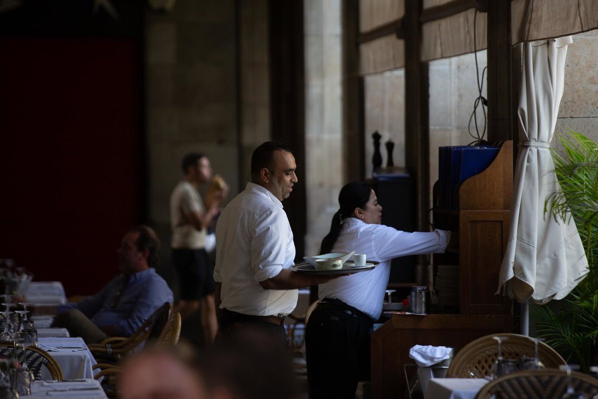 Archivo – Un camarero sostiene una bandeja en la plaza Real de Barcelona.