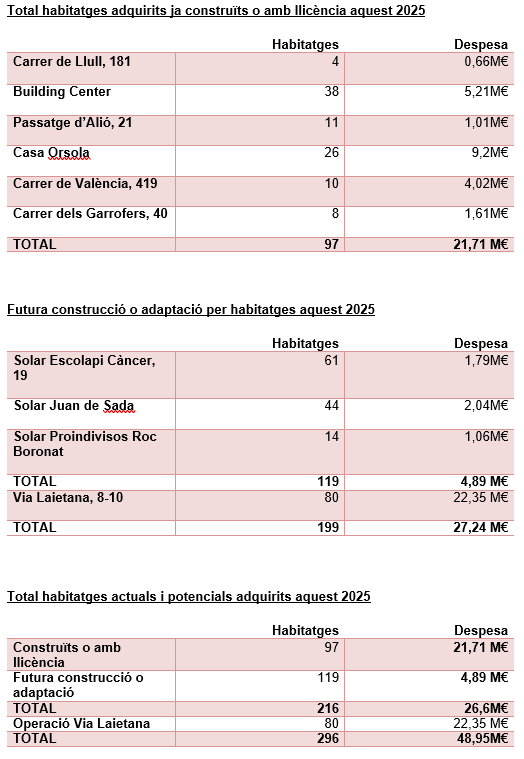 Les adquisicions durant l’any inclouen la compra de diverses propietats, com la Casa Orsola, amb 26 habitatges, i altres habitatges als carrers d’Alió, València, Llull, Garrofers i a la immobiliària Building Center de CaixaBank. A més, s’ha comprat sòl per a la construcció de nous habitatges, com el solar al carrer de l’Escolapi Càncer 19 a Torre Baró.