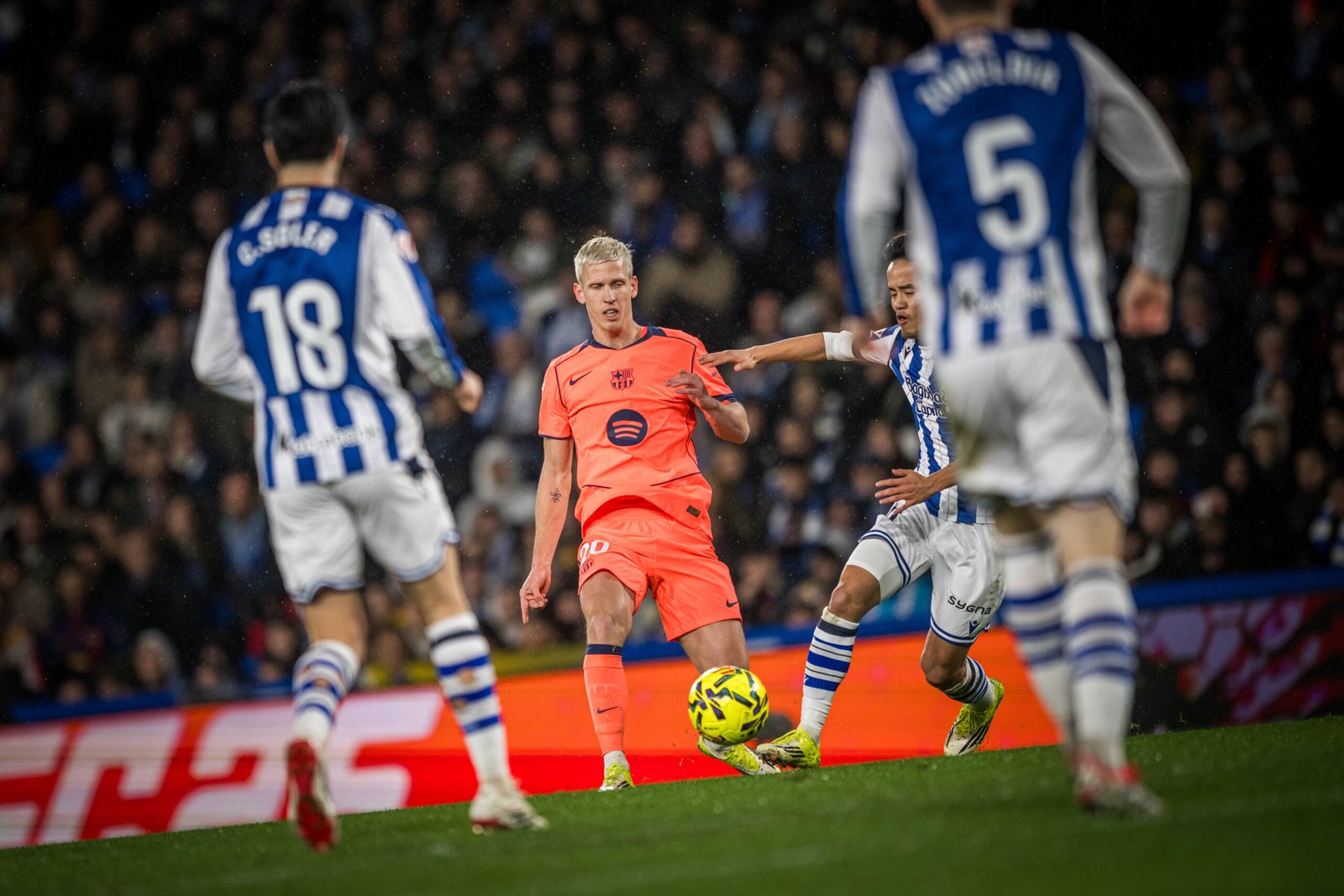 Ara, la sortida ha estat per a la Real Societat, i tot en la segona part. Va començar, per partida doble, Dani Olmo. Al minut 47 primer, i al 48 després, va perdonar el que hauria estat l’empat a un, en dues ocasions. Després, al 66, Remiro va volar per aturar un gran capçal de Lewandowski i el baló, després de l’aturada del porter, va rebotar al pal i va marxar fora.